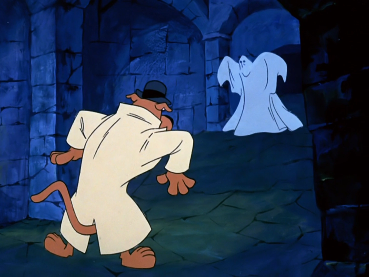 En el sótano, encontraron una puerta que lograron abrir con la llave. Allí encuentran un montón de objetos utilizados normalmente por magos y también al Fantasma. El Fantasma los persigue un rato hasta que lo logran evadir, tras perderlo los muchachos preparan una trampa con Scooby como carnada disfrazado como humano para que el Fantasma lo persiga.