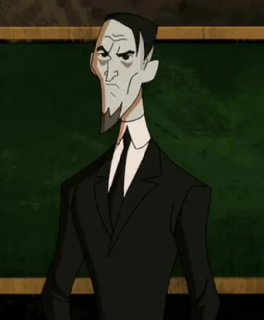 Il a les cheveux noirs et des cernes sombres sous les yeux. Il porte également un smoking noir avec une cravate. Il est également maigre.