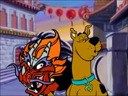 Detektywi są już na miejscu. Kudłaty chce zrobić sobie zdjęcie z Kamiennym Smokiem, który ożył! Detektywi uciekli, lecz Scooby-chrupki rozsypały się i trafiły na pobliską wieżę. Co za pech!