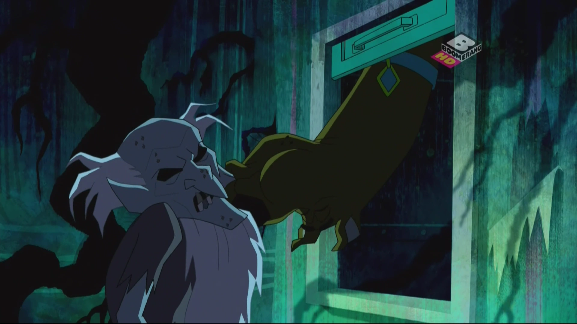 Danny biegał po willi ze swoim pogrzebaczem, aż z szybu na ubrania doszedł go głos: "Danny Darrow! Danny Darrow! Mówi do ciebie twoja mama!". Staruszek dał się nabrać i zajrzał do szybu, gdzie Scooby dał mu buziaka. Rozwścieczony antagonista chcąc dopaść psa wpadł do szybu, przeleciał przez pralnię aż do windy, która zawiozła go do salonu i wystrzeliła go wprost na fortepian, który rozwalił się pod wpływem uderzenia.