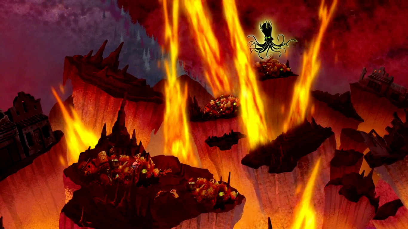 Agreeing to this deal, the Entity seizes Pericles and pours its essence into his body, causing him to grow into a dark green giant. Gloating about his newfound power, Pericles prepares to destroy the gang, but the Evil Entity proceeds to subdue his consciousness and mutate the parrot's body into a massive squid-like monster with horns. Brad Chiles and Judy Reeves offer themselves as servants to the Entity, but the monster instead consumes them to increase its own strength. It then assumes control of the Kriegstaffebots, sending them to capture the gang and Mr. E.
