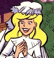 Cyndy is a young woman with long flowing blonde hair and blue eyes. She's seen wearing two different outfits: The first consists of a tight-fitting white wedding dress, with long tight sleeves, a high closed collar, a white flowing cloth-band tied around the her waist, a long white wedding veil, and finally white pearl earrings. The second outfit consists of a pink dress with long set-in sleeves and an open shirt-collar.