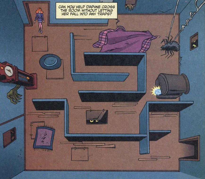 The gang are splitting up in a haunted house while Daphne goes to venture off in a separate room, before getting joked on by Velma about trying not to fall in a trap door.