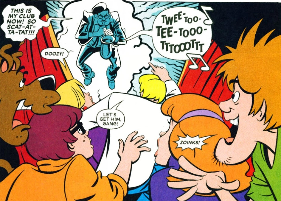 An old jazz legend's night club is in trouble as his house band, The Doozy 3 are breaking up. One of the reasons for the break up is the club is haunted by the ghost of the great jazz musician and best friend to the owner, Doozy Gilespie. Doozy wants his old friend to give up the band and night club. Scooby and gang come in and investigate to find out that the old friends split up when Stinger decided to settle down with a woman, Jess and run the night club. But Scooby and gang uncover that it was Jess and the band's drummer trying to scare Stinger into retirement so Jess can take over the night club.
