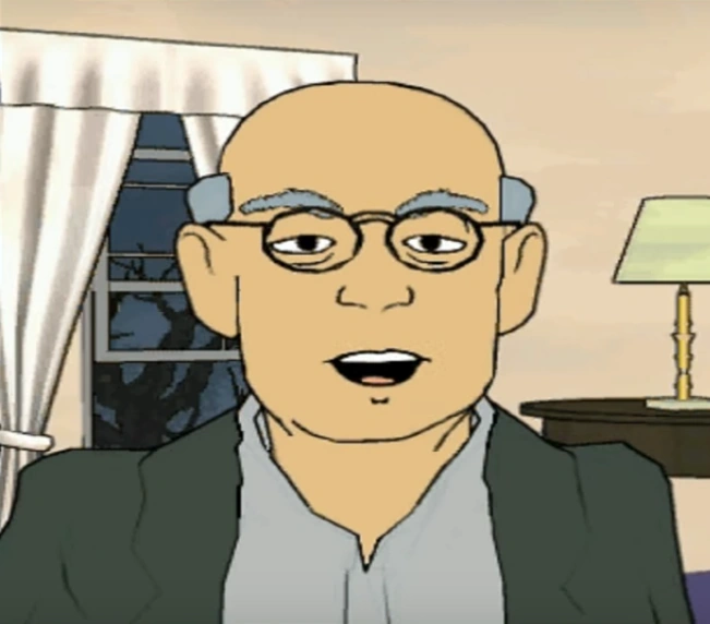 Seemingly taller than all the members of Mystery Inc., he was an older, balding man with gray hair on only the sides and back of his head. He wore glasses, brown shoes, black pants, a brown belt, a gray overcoat, and a white semi stripped undershirt.