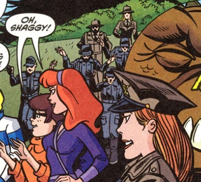 Mystery Inc. was in the town's Paul Bunyan Hotel when the footprints were made. While Daphne and Velma witnessed the culprits looting the town, Fred, Shaggy, and Scooby followed the monster into the woods, finding the metal foot used to make the prints. They then found the monster itself and operated it to stop the culprits. They first had the monster roar, scaring the helicopter pilots and causing some to crash. Then, they knocked the monster over, blocking a road and preventing the truck drivers from escaping. Mystery Inc. entrusted local authorities with capturing the remaining helicopter pilots.