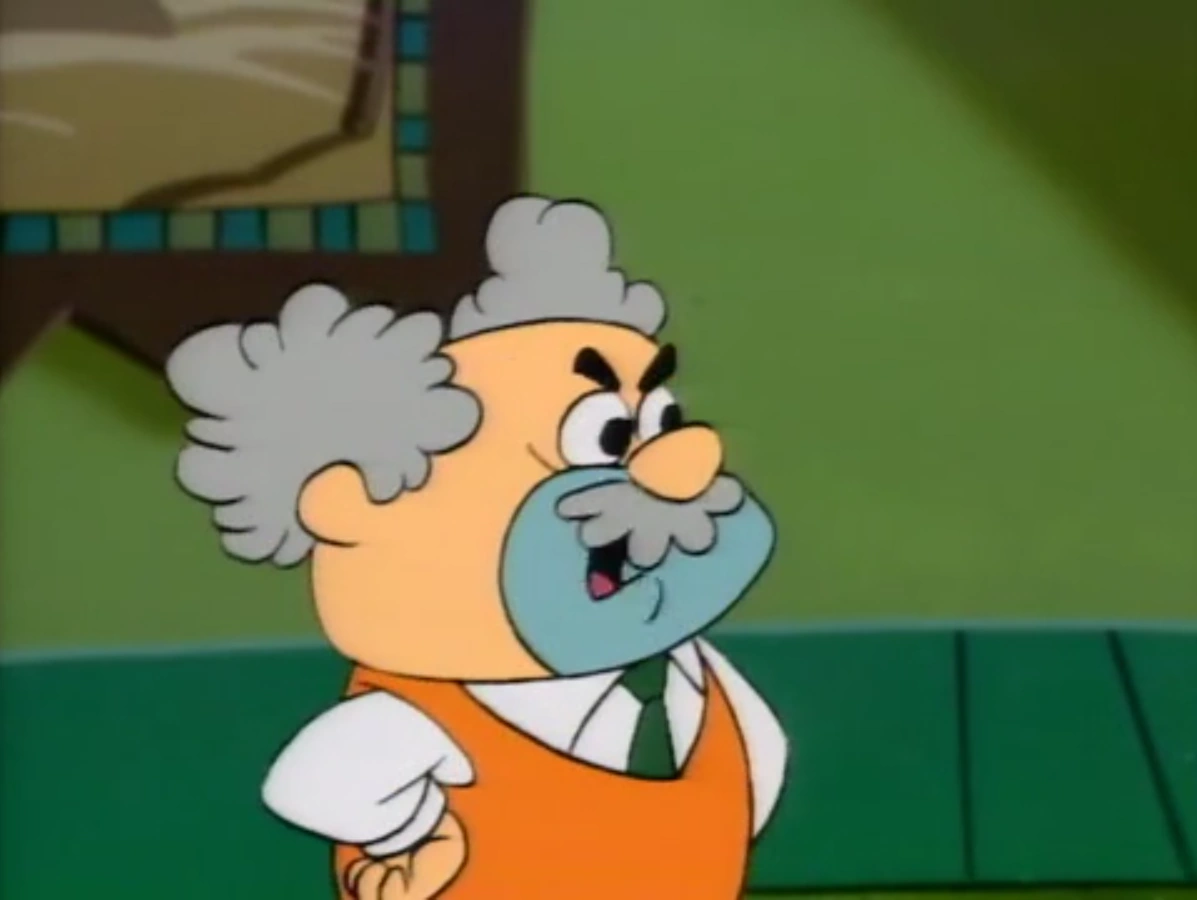 He is a quite short middle-aged man, with curly gray hair, a 5 o'clock shadow, and a bushy mustache. He wears green pants, black shoes, an orange sleeveless vest over a white button-down shirt and a dark green tie.