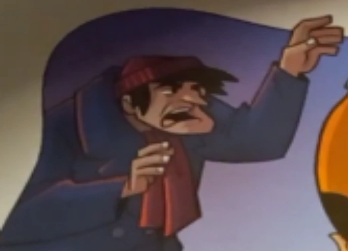 Shark is an elderly man with unkempt black hair hidden underneath a reddish purple hat, and wears a large blue coat and has a reddish purple scarf around his neck.