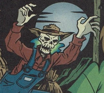 The phantom had the appearance of an adult man, but has a glowing blue and green skull for a head and claw looking hands. He wears a brown farmers hat with a red stripe around it, a long with blue overalls and brown shoes over a red shirt with a collar and a button.