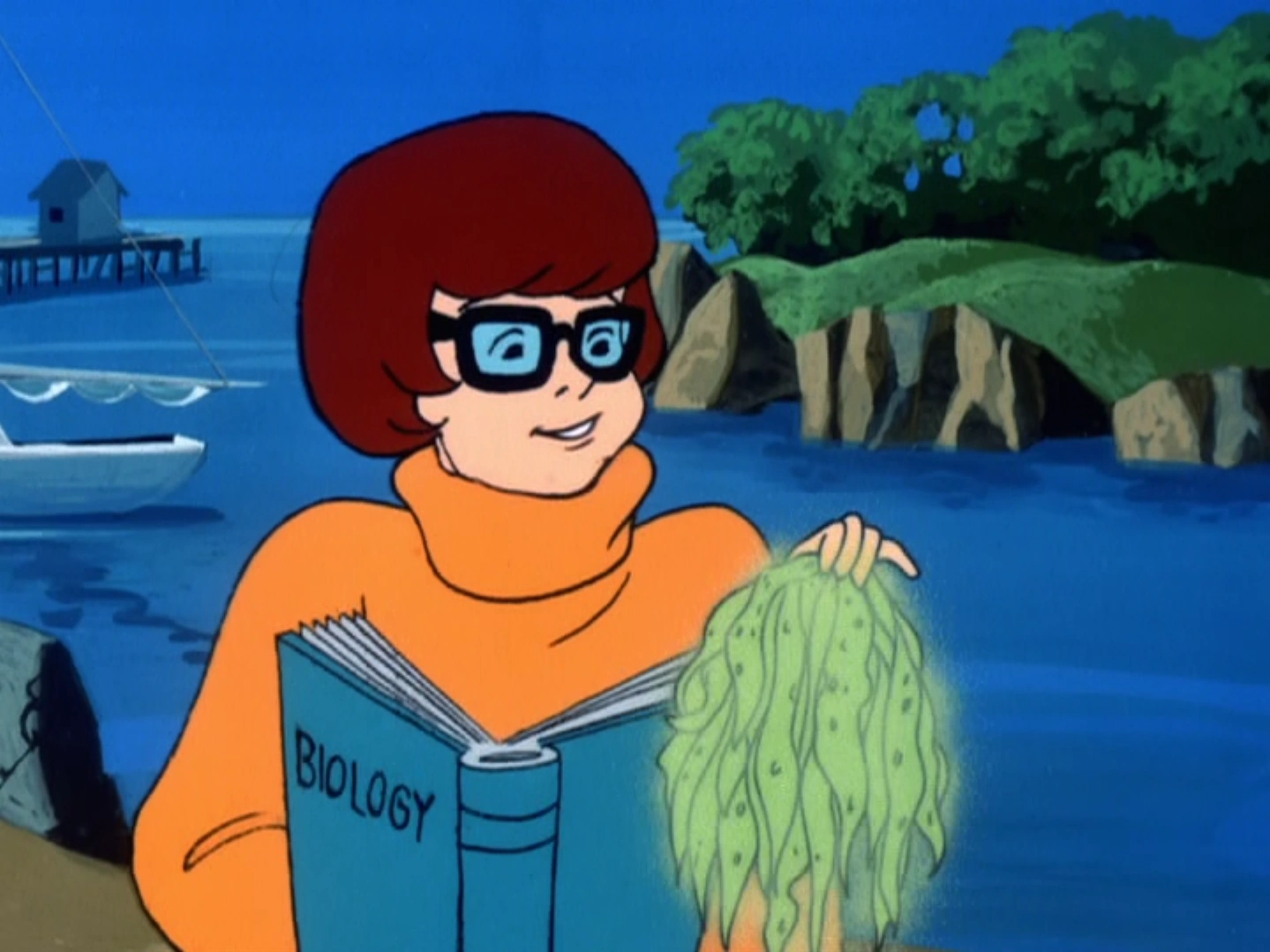 Velma examines the strange glowing seaweed.