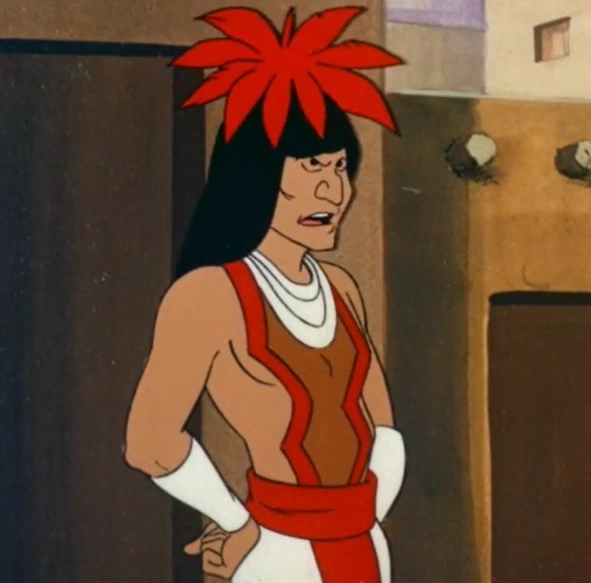 He is an adult Native American man with a gaunt face, long black hair and a large nose.