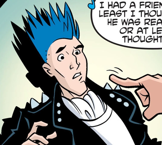Fortissimo is a man with long, spiky blue hair combed straight up and a protruding chin. While in costume, he wore a black leather biker jacket with grey spikes on it, a white shirt, and a white ascot, as well as red plaid pants tucked into black boots. However, as a janitor, he wore a much less lavish brown uniform with a cylindrical cap and a nametag bearing his first name.