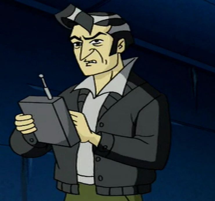 Skull is an adult male with black hair with gray streaks. He wears a black jacket over a white shirt and green pants.