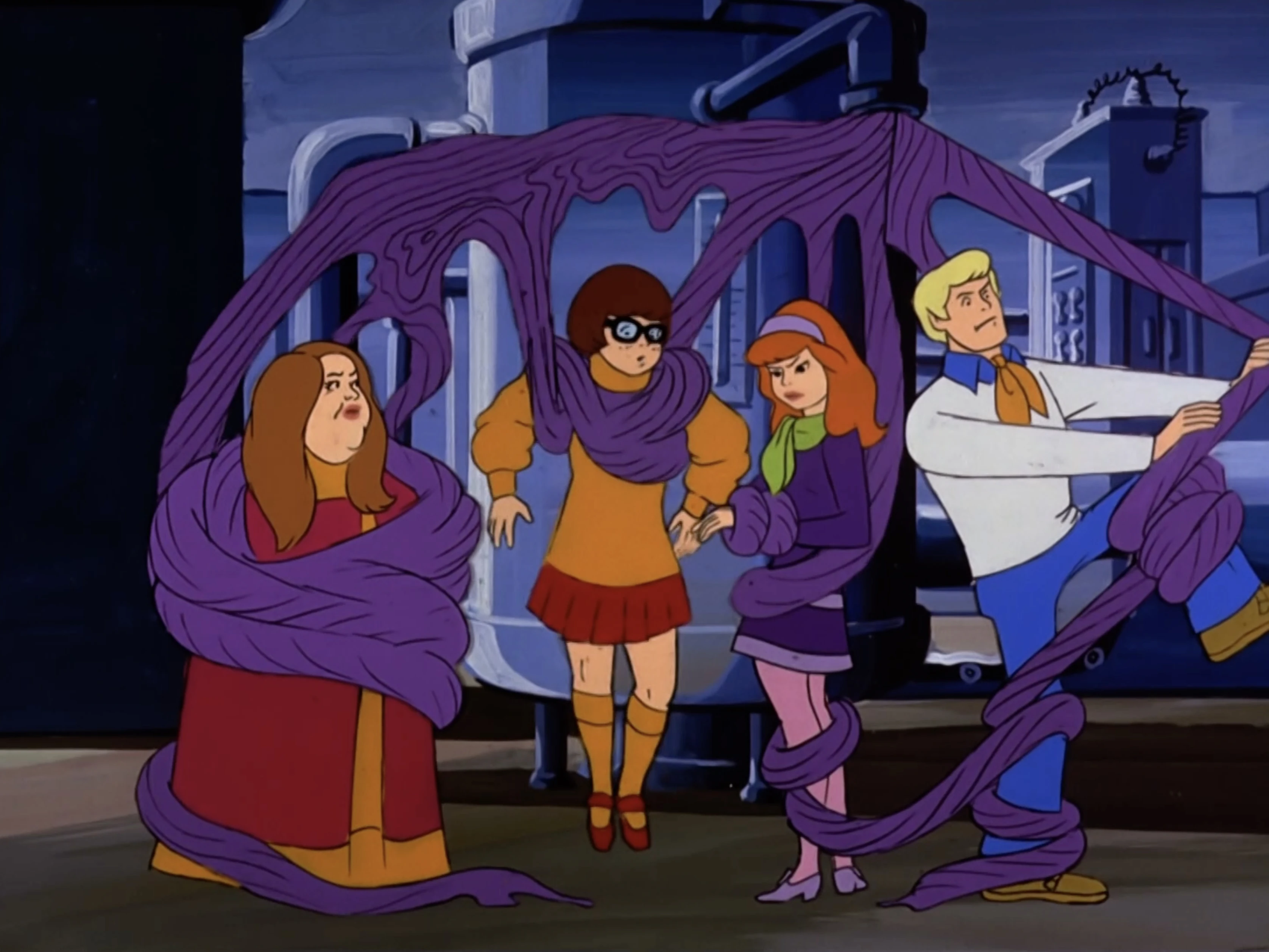 Taffy is revealed to be one of the products of the Sugar Plum Candy Company when the Green Globs turn on a machine that sends some coiling around Cass Elliot, Velma, Daphne and Fred. Unable to escape the "gunk," the group walks around as one big glob, scaring Scooby-Doo and Shaggy into thinking they're "purple goops." Shaggy later gets himself stuck in the taffy with the others, to which Fred tells him not to struggle because it'll only make it hold him more. After Cass says that even Scooby couldn't eat them out of it, and he agrees, the globs leave them alone, satisfied that it'll hold them for hours.
