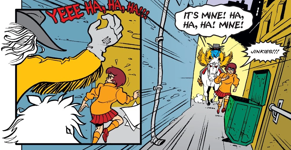 Alex Simmons evokes a ghost from the Pony Express for the gang to lasso in a fairplay caper that features a classic-styled Scooby/Shaggy dodge. The writer shows flair for his subject when turning about the scheme of ghostly impersonation.