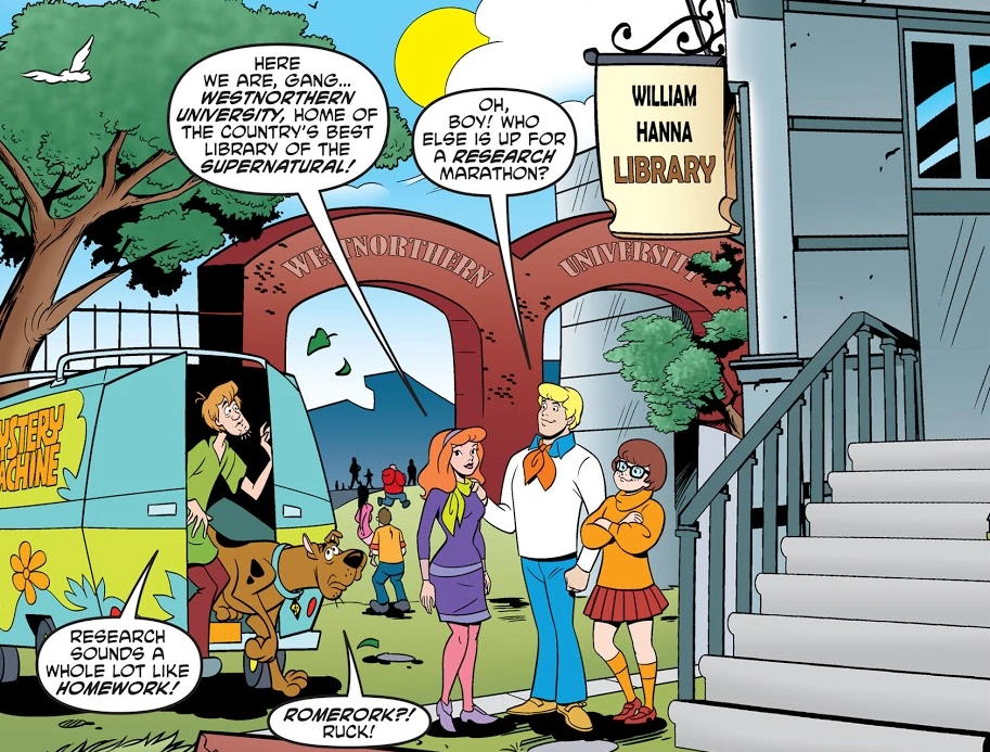 The gang visited to do some research in the library, but Shaggy Rogers got mixed up in an enlarging experiment.