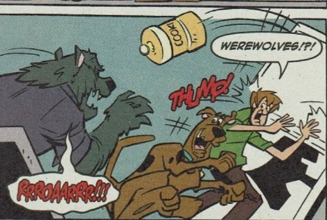 Joe Staton does his as usual level best to keep Mystery Inc. in character and Scooby and Shaggy in the kitchen. Pay close attention to Staton's superb worm's-eye back view of Scooby nearly on his haunches and Shaggy hunched over the refrigerator.[1]